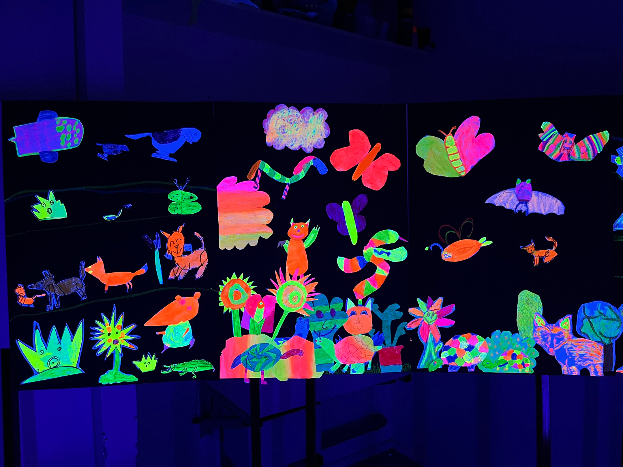 Im Dezember war es wieder soweit. Die Kunsträume des GymNeander verwandelten sich in ein Schwarzlichtkino. Die Kunstlehrerinnen Frau Grothkast und Frau Schaefer hatten Besuch von sehr interessierten, kreativen ViertklässlerInnen der Regenbogenschule Erkrath, die sich zu einem traditionellen Kunstprojekt in Zusammenarbeit mit der Stadtbücherei Erkrath angemeldet hatten. Auf diese Weise konnten die kleinen KünstlerInnen unsere Schule kennen lernen, und es wurde einen ganzen Tag lang gezeichnet, gemalt, geschnitten und geklebt. Am Ende entstand eine Ausstellung als Schwarzlichtkino und die wundersamen Tiere und Pflanzen wurden zum Leben erweckt. – Neugierig geworden? Überzeugen Sie sich selbst: Die Ergebnisse der KünstlerInnen können ab sofort in der Stadtbücherei auf der Bahnstraße bewundert werden.